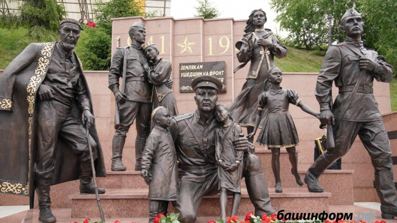 Мемориал в память ушедших на фронт Великой Отечественной войны представляет собой семь фигур. Все они одеты в разные национальные костюмы. Как объяснил первый заместитель премьер-министра правительства Башкирии Андрей Назаров, это сделано для того, чтобы подчеркнуть многонациональность нашего народа. Объект воплотил в жизнь скульптор Вадим Кириллов вместе с авторским коллективом.