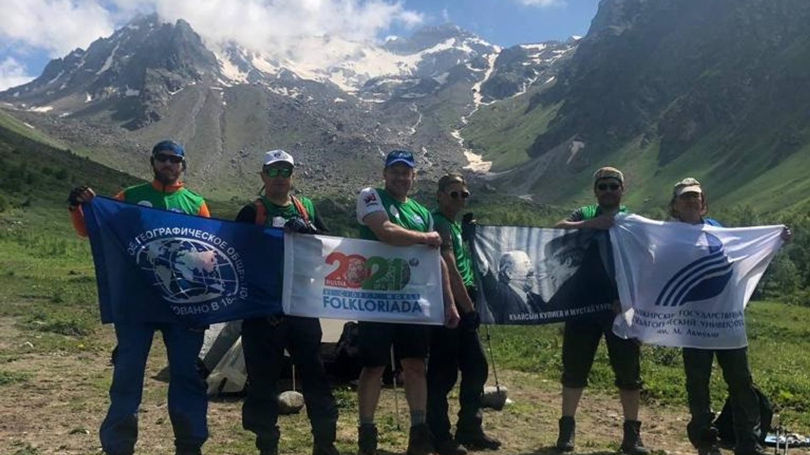 Члены экспедиции башкирского отделения Русского географического общества водрузили флаг VI Всемирной Фольклориады на пике Мустая Карима, который расположен в Кабардино-Балкарской Республике.