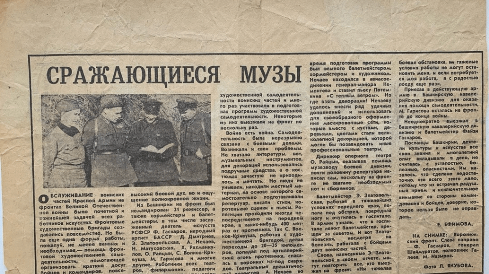 "Дочь легендарного балетмейстера Гюльнара Аиткулова (Гаскарова) передала коллективу газетную вырезку военных лет. В статье упоминается имя заслуженного деятеля искусств РСФСР Файзи Гаскарова. Этот шаг отмечен особой символичностью ввиду празднования в этом году 75-летнего юбилея Великой Победы в ВОВ", - рассказали в Министерстве культуры Республики Башкортостан.