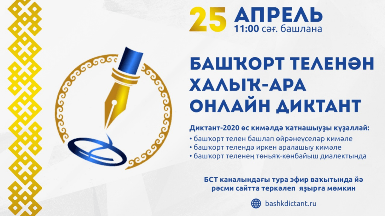 Так, 25 апреля в 11:00 часов (по уфимскому времени) на телеканале «Башкирское спутниковое телевидение», в социальных сетях «ВКонтакте», «Instagram», видеохостинге «YouTube» начнется прямая трансляция чтения диктатором текста диктанта: