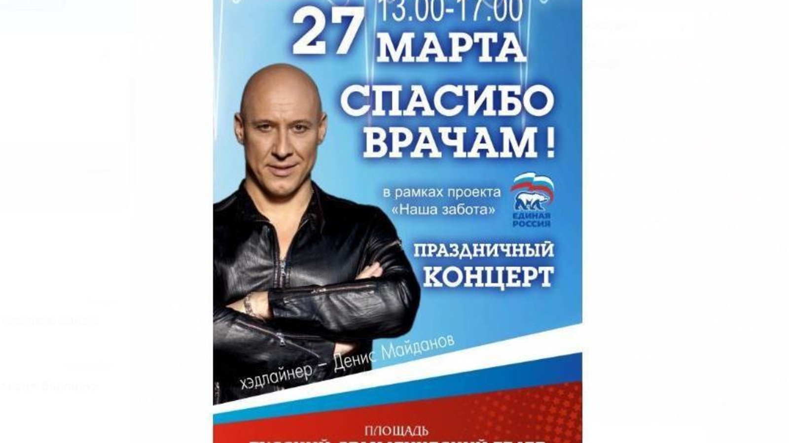 27 марта в Уфе на площади перед Государственным академическим русским драматическим театром Республики Башкортостан состоится концерт «Спасибо врачам!». Концерт в формате open air пройдет в рамках проекта «Единой России» «Наша забота». Начало концерта в 13 часов.