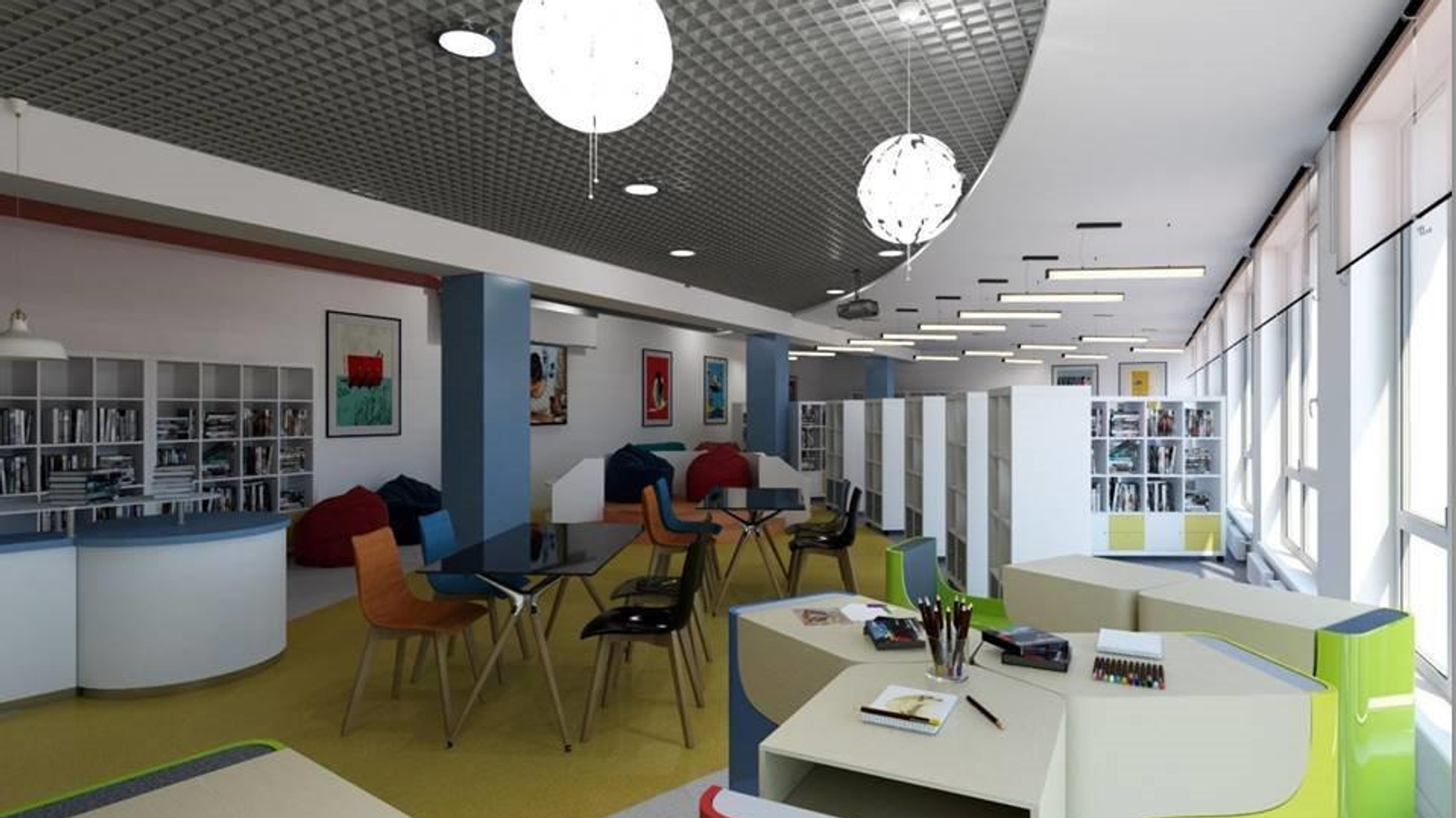 Вся мебель в проекте мобильна и легко расположена вдоль глухих стен, предоставляя больше свободного пространства для различных массовых мероприятий. Дополнительные посадочные места могут быть организованы за счет складных стульев. Предусмотрена удобная зона для работы в группах, проведения небольших семинаров, олимпиад, мастер-классов, а также для настольных игр в компании.