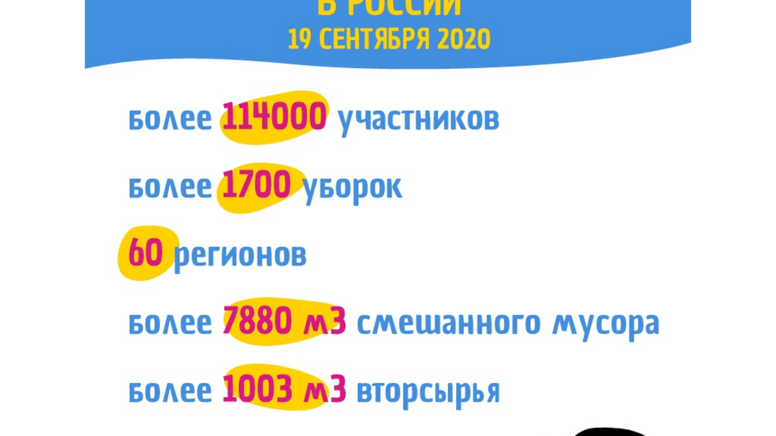 Организаторы мероприятия благодарят всех участников, кто присоединился с небольшой и индивидуальной уборкой, выступил организатором уборки и координировал команды, курировал акцию в своем регионе или округе, искал партнеров и приглашал представителей властей и министерств.