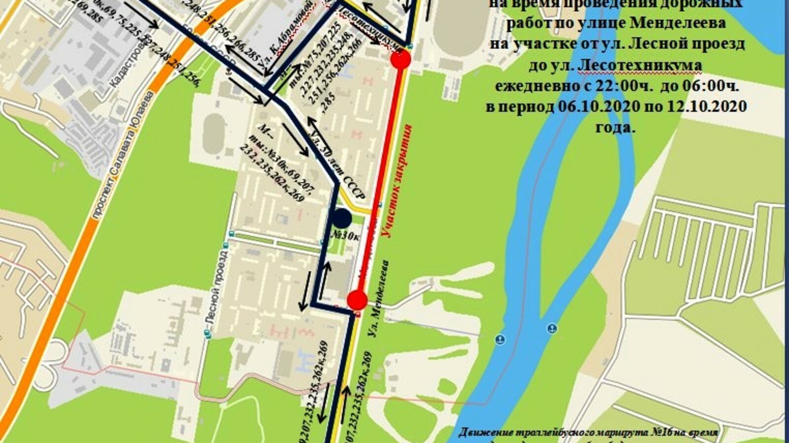 В столице Башкортостана до 12 октября перекроют движение транспорта по улице Менделеева на участке от Лесного проезда до улицы Лесотехникума.