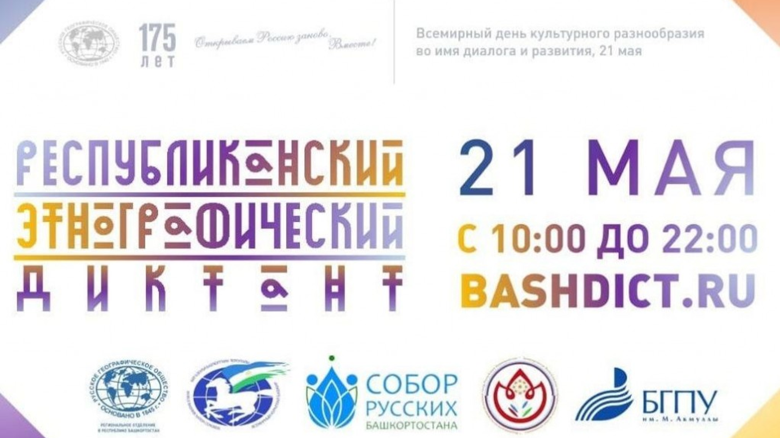 21 мая в Башкортостане пройдет Республиканский этнографический онлайн-диктант в виде теста. Диктант посвящен 175-летию основания Русского географического общества и Всемирному дню культурного разнообразия во имя диалога и развития.