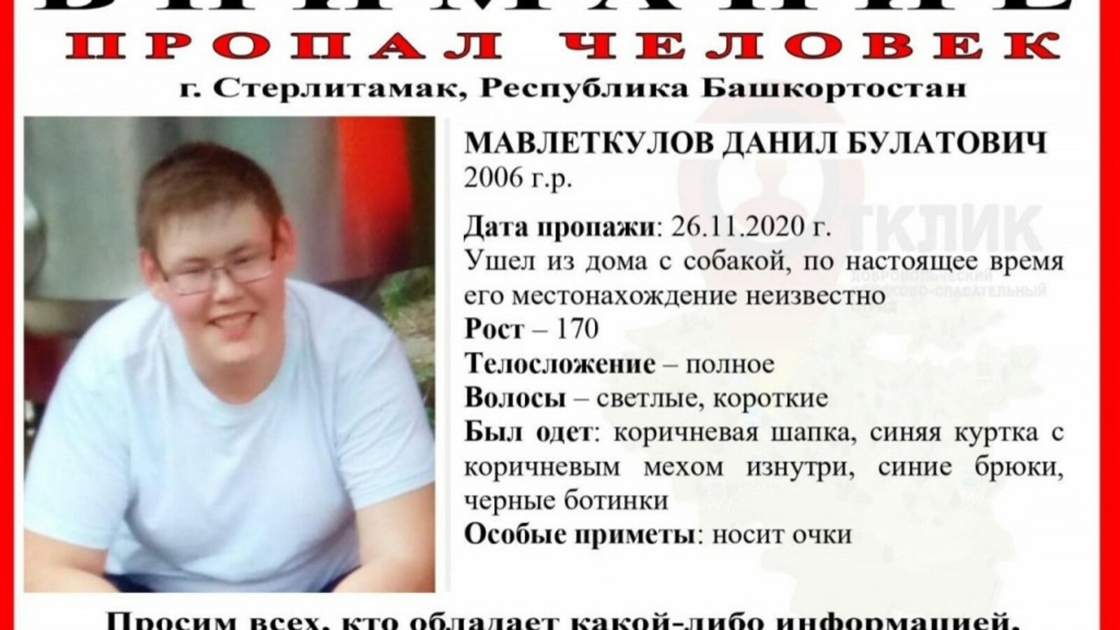В Стерлитамаке пропал без вести 14-летний Данил Мавлеткулов. Как сообщил 27 ноября поисково-спасательный отряд «Отклик» «ВКонтакте», подросток 26 ноября ушел из дома с собакой, по настоящее время о его местонахождении ничего неизвестно.