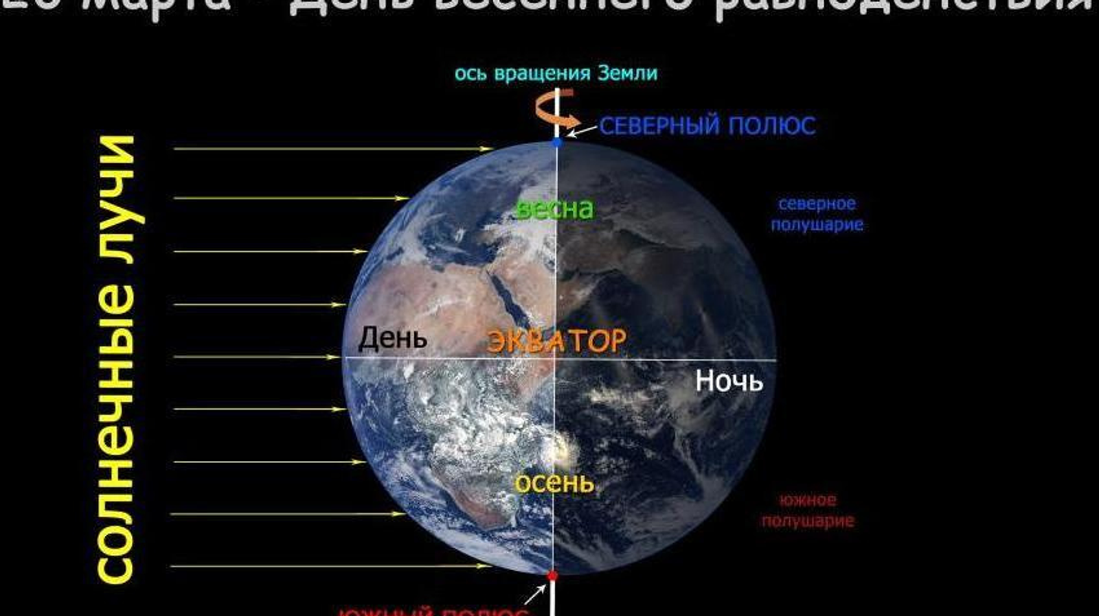 В день весеннего равноденствия Солнце переходит из южного полушария небесной сферы в северное. В северном полушарии Земли наступает астрономическая весна, а в южном — астрономическая осень. День в северном полушарии становится длиннее ночи, а в южном полушарии короче.