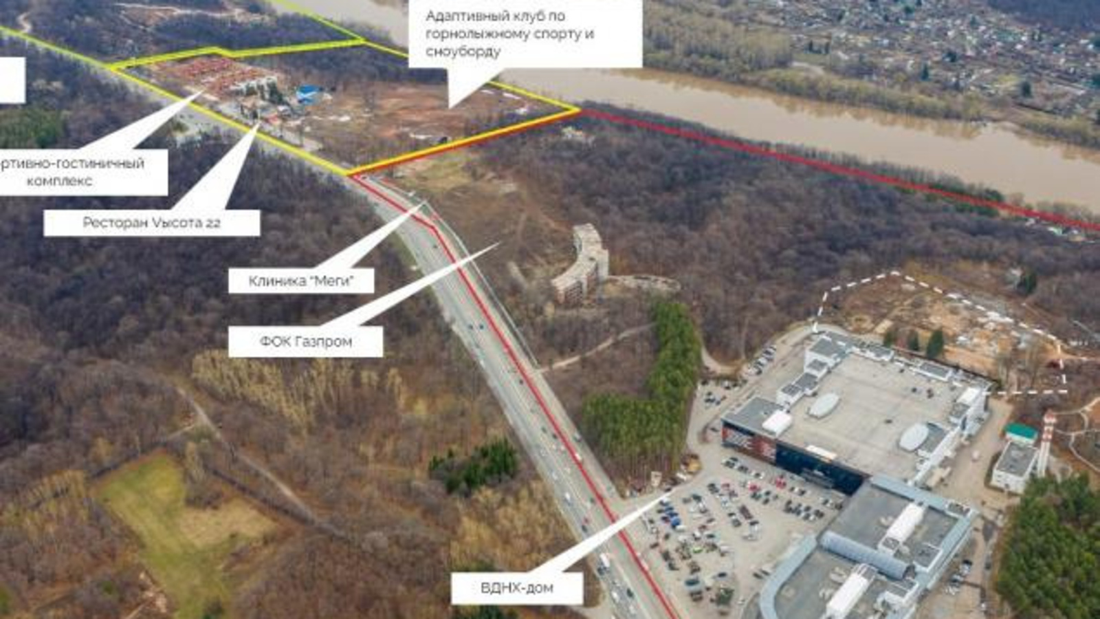 Согласно приведённой на сайте мэрии схемы, севернее комплекса ВДНХ вдоль улицы Менделеева расположатся ФОК Газпрома, клиника Меги, ресторан Высота, гостиничный комплекс. Горнолыжный комплекс АкЙорт останется на прежнем месте.