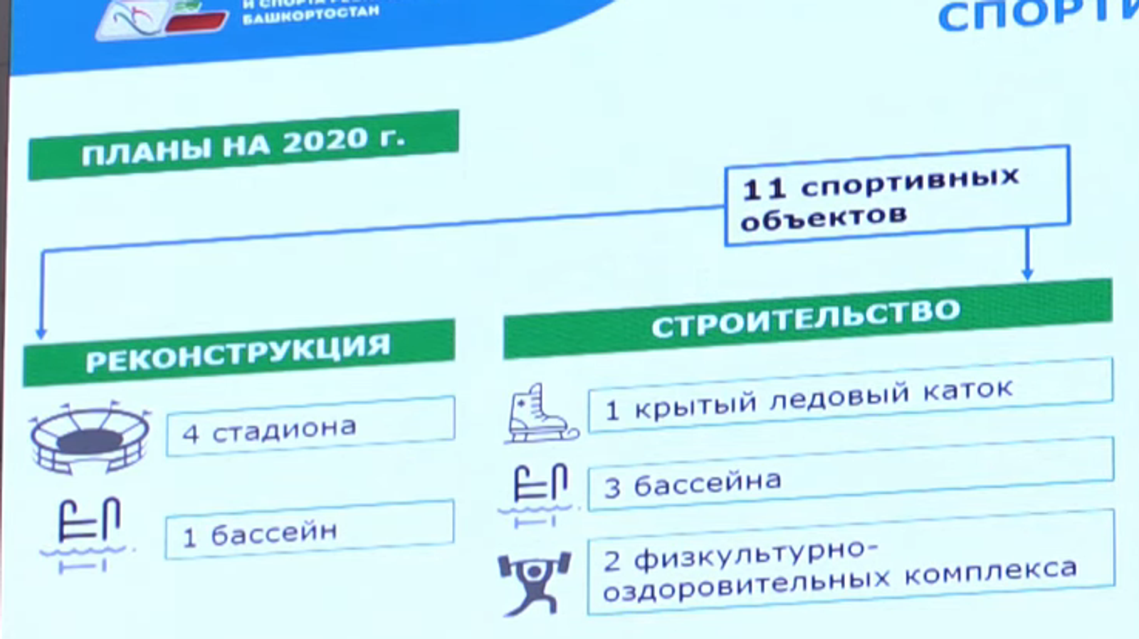 «Это реконструкция четырех стадионов: в Белорецке — «Металлург», в Мелеузе — «Спартак», в Нефтекамске «Торос», в Кумертау — «Шахтер». В этом году завершится реконструкция уфимского бассейна «Нефтяник». В Ишимбае достроим крытый каток. Также запланировано строительство трех бассейнов в Федоровке, Ермолаево, Акъяре. ФОКи с бассейном появятся в Раевке, Шаране. Ну и еще 16 бассейнов до 2024 года по типовым проектам будут построены во всех муниципалитетах республики», — пояснил министр молодежной политики и спорта Башкирии.