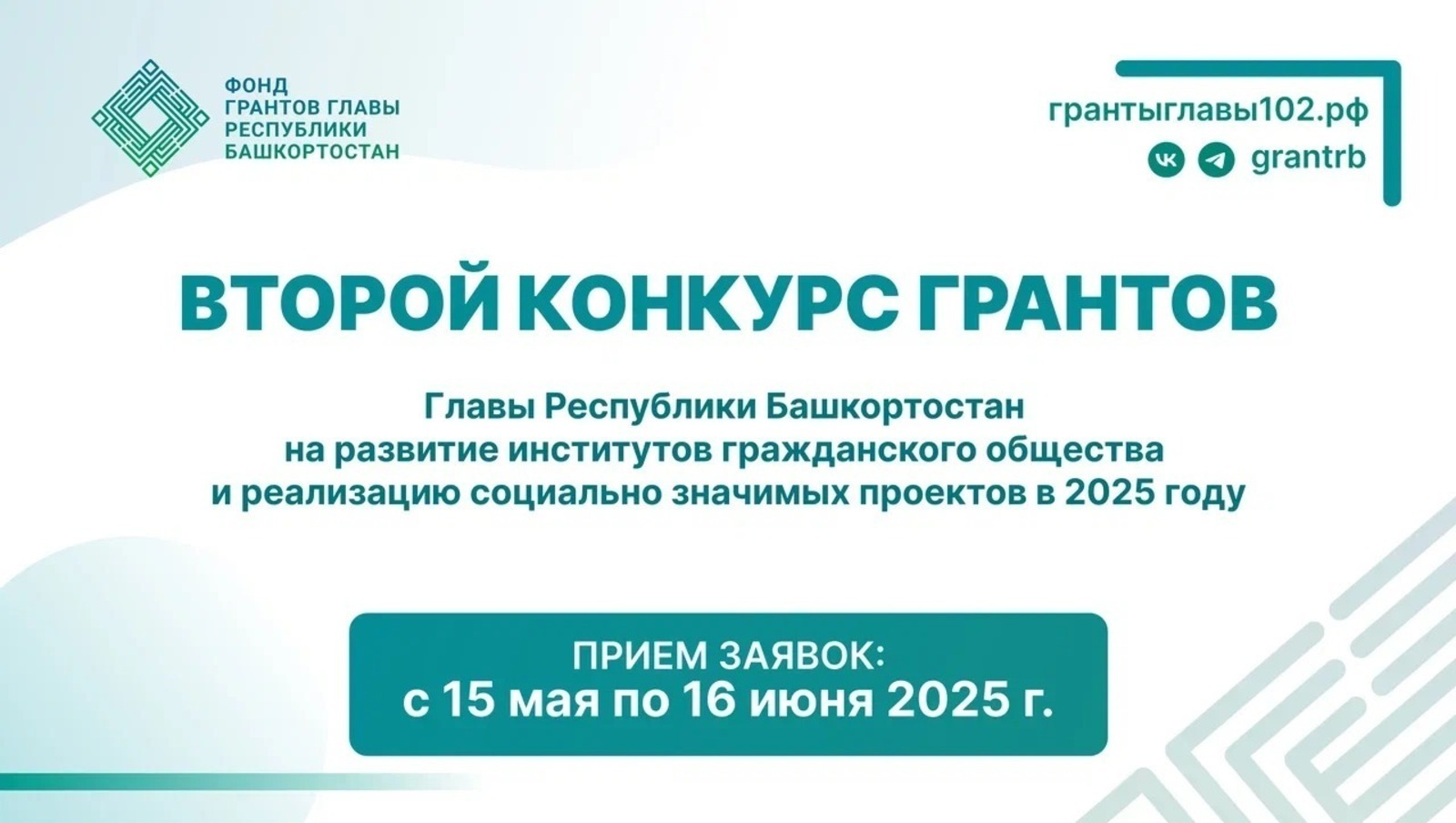 Дата начала приема заявок — 15 мая 2025 года. Фонд завершает прием заявок на участие в конкурсе 16 июня 2025 года в 17.00 по местному времени. Заявки принимаются на сайте грантыглавы102.рф, на котором в разделе «Документы» также можно ознакомиться с положением конкурса и подробной информацией о требованиях к участникам конкурса, условиях и порядке предоставления грантов.