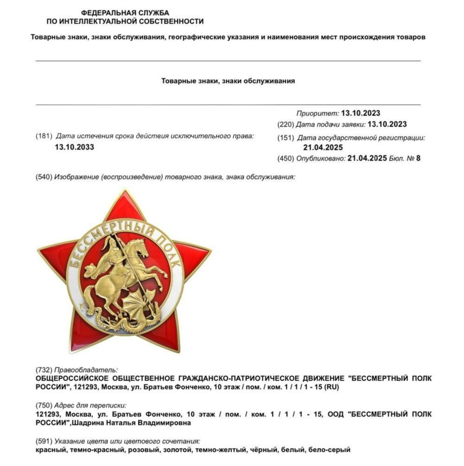 Общероссийское гражданско-патриотическое движение «Бессмертный полк России» зарегистрировало в Роспатенте эмблему, под которой пройдет акция. Об этом сообщает РИА Новости.